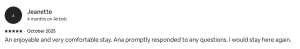 An enjoyable and very comfortable stay. Ana promptly responded to any questions. I would stay here again.