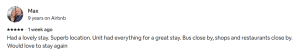 Had a lovely stay. Superb location. Unit had everything for a great stay. Bus close by, shops and restaurants close by. Would love to stay again