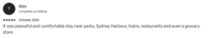 It was peaceful and comfortable stay near parks, Sydney Harbour, trains, restaurants and even a grocery store