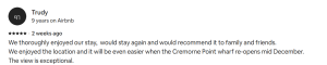 We thoroughly enjoyed our stay, would stay again and would recommend it to family and friends. We enjoyed the location and it will be even easier when the Cremorne Point wharf re-opens mid December. The view is exceptional.