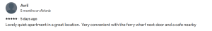Lovely quiet apartment in a great location. Very convenient with the ferry wharf next door and a cafe nearby