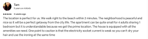 The location is perfect for us. We walk right to the beach within 2 minutes. The neighborhood is peaceful and nice so it will be a perfect getaway from the city life. The apartment can be quite small for 4 adults sharing 1 bedroom but it is understandable because we get the prime location. The house is equipped with all the amenities we need. One point to caution is that the electricity socket current is weak so you can\'t dry your hair and use the ironing at the same time