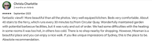 fantastic view!!! More beautiful than all the photos. Very well equiped kitchen. Beds very comfortable. About 40 stairs to the ferry, which runs every 30 minutes to/from Circular Quay. Wonderfully maintained garden with potential barbecue facilities, but it was rusty and out of order. We had some difficulties with the heating: in some rooms it was too hot, in others too cold. There is no shop nearby for shopping. However, Mosman is a beautiful place and you can enjoy a nice walk. If you like unique impressions of Sydney, this is the place to be. Absolute recommendation.