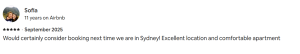 Would certainly consider booking next time we are in Sydney! Excellent location and comfortable apartment