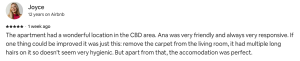 The apartment had a wonderful location in the CBD area. Ana was very friendly and always very responsive. If one thing could be improved it was just this: remove the carpet from the living room, it had multiple long hairs on it so doesn’t seem very hygienic. But apart from that, the accomodation was perfect.