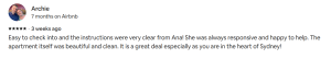 Great customer service all around there when I needed her. The apartment was nice and cozy felt like a little home away from home. Quiet but also around a lot of things to do. Whether it’s to grab a bite, drink, go shopping or just sightseeing. High recommend!! And you really can’t beat the price. If/when I go back to Sydney I would definitely stay here again!! Very professional and reliable if you ever have a question. Definitely a 5 star stay for me.