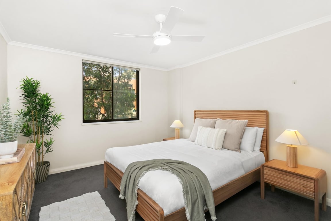 The bright, north-facing interiors overlook a park, creating a quiet space within the city. The master bedroom includes an ensuite and walk-in wardrobe, while the second bedroom has built-in storage and a full bathroom with a bathtub and shower.