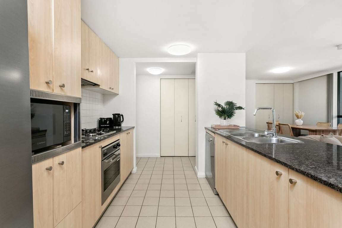 The kitchen features granite benchtops and stainless-steel appliances, and is fully equipped with cookware, tableware, and basic pantry items. Meals can be enjoyed indoors or on the balcony. The interior is furnished for practicality and comfort, with a living area that offers ample seating, a smart TV, and natural light from floor-to-ceiling windows. Both bedrooms are spacious and designed for rest, with clean, simple décor.