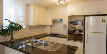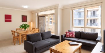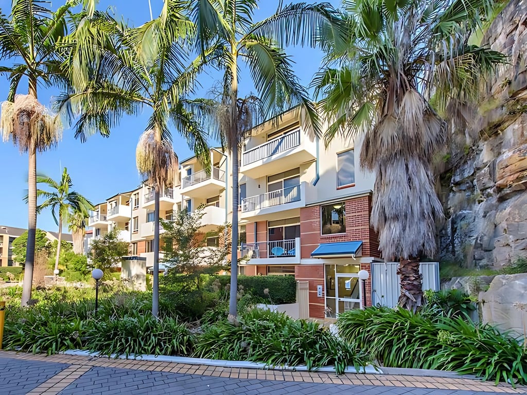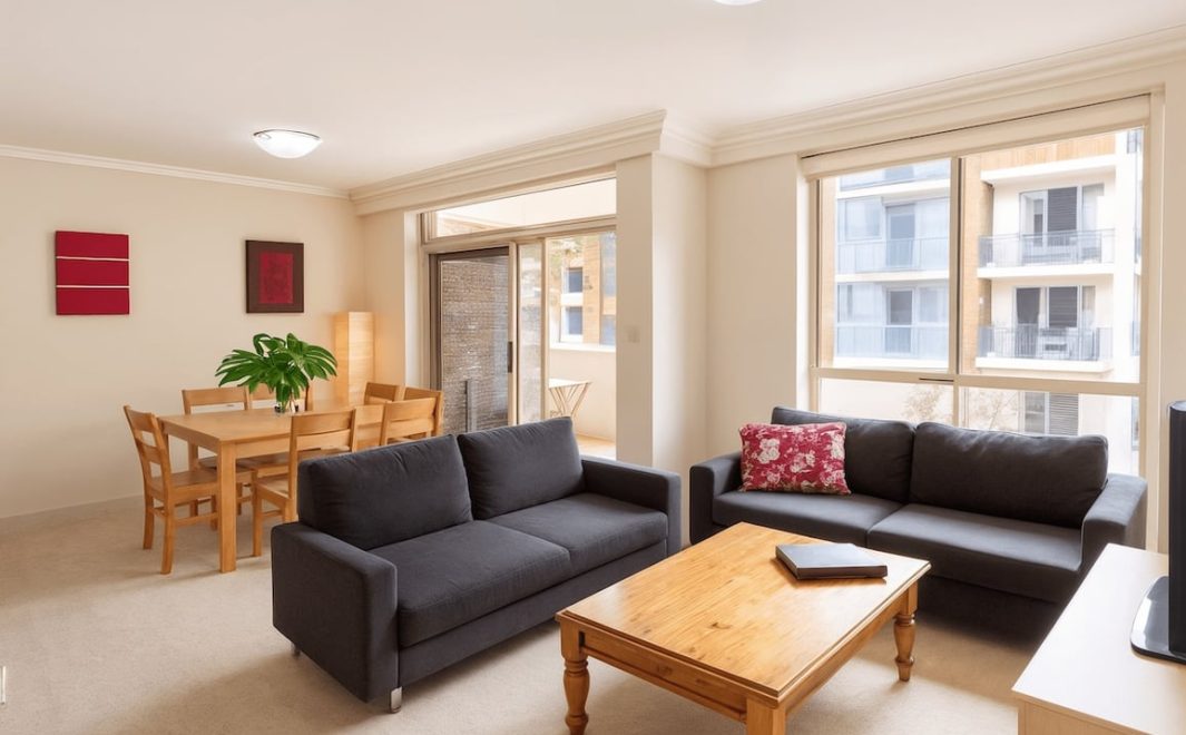 The property is furnished with modern fittings and appliances. Both bedrooms feature private balconies. Sydney’s iconic harbour bridge can also be seen from the end of the road.