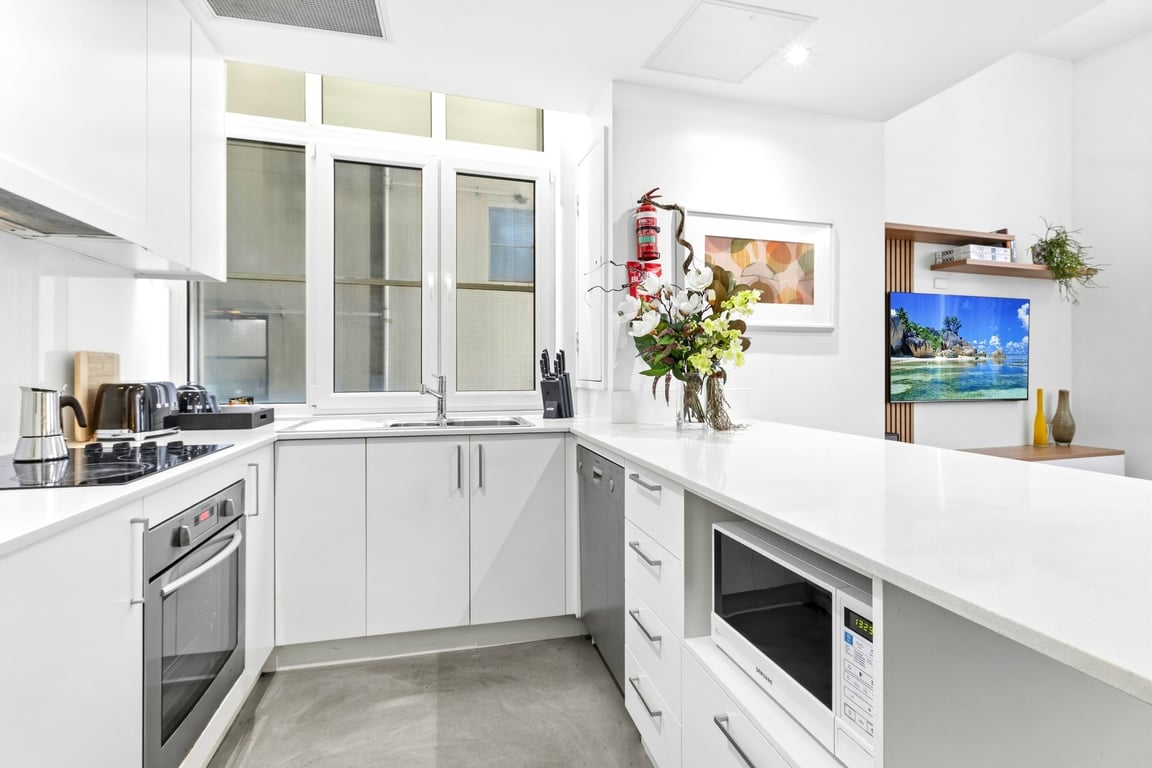 Inside, the apartment is simple and smart: a spacious bedroom with built-ins, a modern bathroom with internal laundry (washing machine & dryer), ducted air for year-round comfort, and a well-equipped kitchen with stone benchtops and stainless steel finishes — including a Nespresso coffee machine, Moka Express, air fryer, rice cooker, NutriBullet, sandwich press, and a full set of cooking pots and pans. You’ll also find the essentials like a kettle and toaster, plus wine and champagne glasses and ice buckets for easy entertaining.