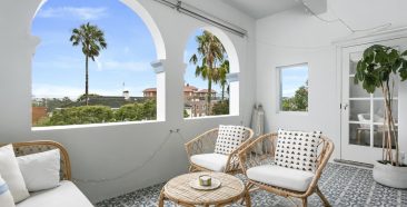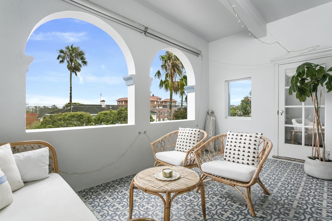 The covered balcony is a standout feature, where elegant archways frame palm tree views, creating a tranquil outdoor retreat. With stylish outdoor seating, it’s the perfect spot for sunset drinks or a lazy afternoon read. A sleek, modern bathroom with a walk-in shower completes the space, ensuring a comfortable and relaxing stay.