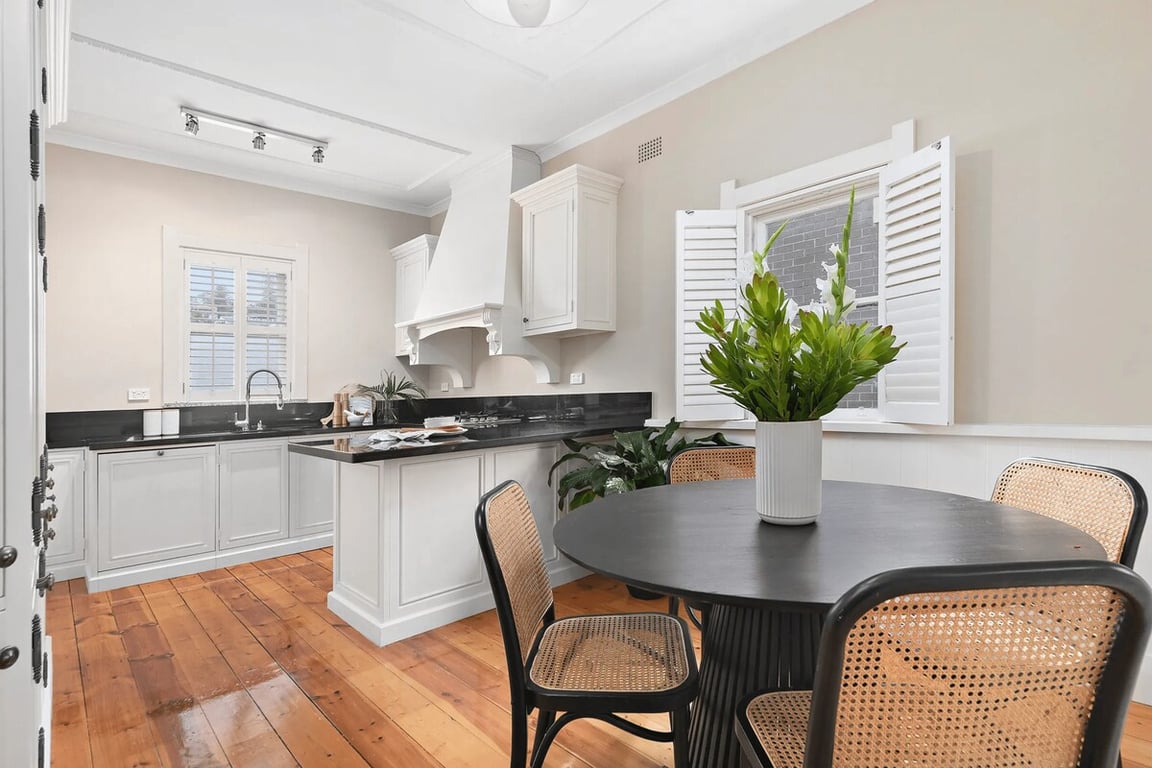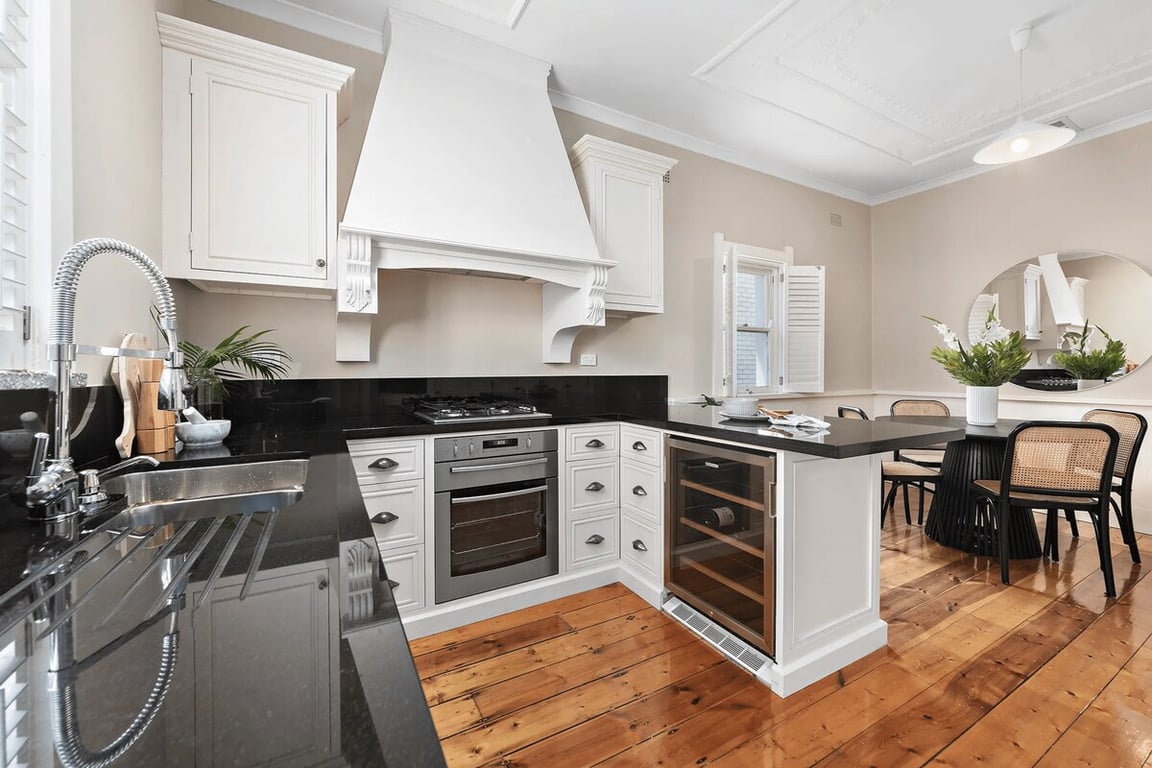 Each of the two bedrooms is generously proportioned and dressed in a soft, neutral palette; the primary bedroom is appointed with built-in wardrobes. The full bathroom has a sense of vintage charm. The kitchen blends contemporary functionality with timeless design, featuring stone benchtops, stainless steel appliances, a Nespresso coffee machine, gas cooking and a wine cooler.