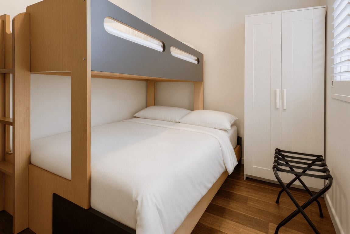 The main bedroom features a comfortable double bed and a large fitted wardrobe. The second bedroom includes bunk beds with a double on the bottom (please note, the top single bunk is suitable for children only).