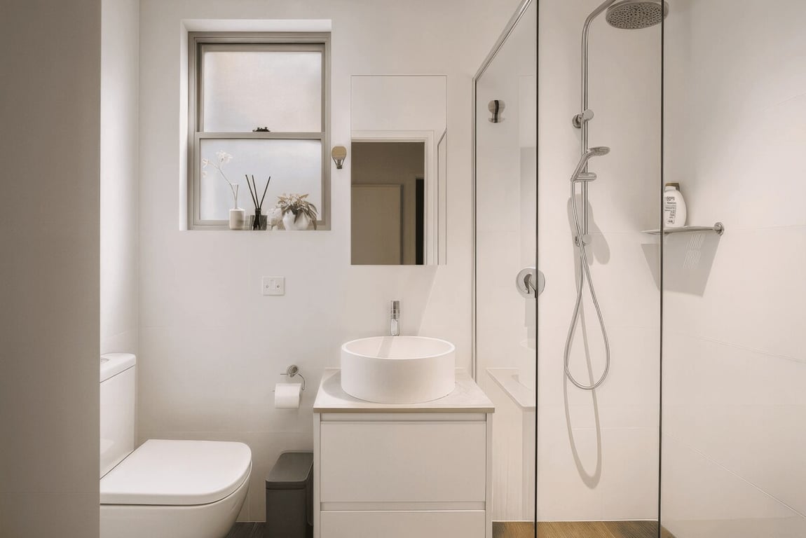 The bathroom is beautifully finished with a spacious walk-in shower, and guests can enjoy access to a communal rear patio, ideal for morning coffee or an evening drink outdoors.