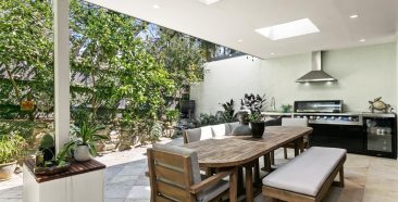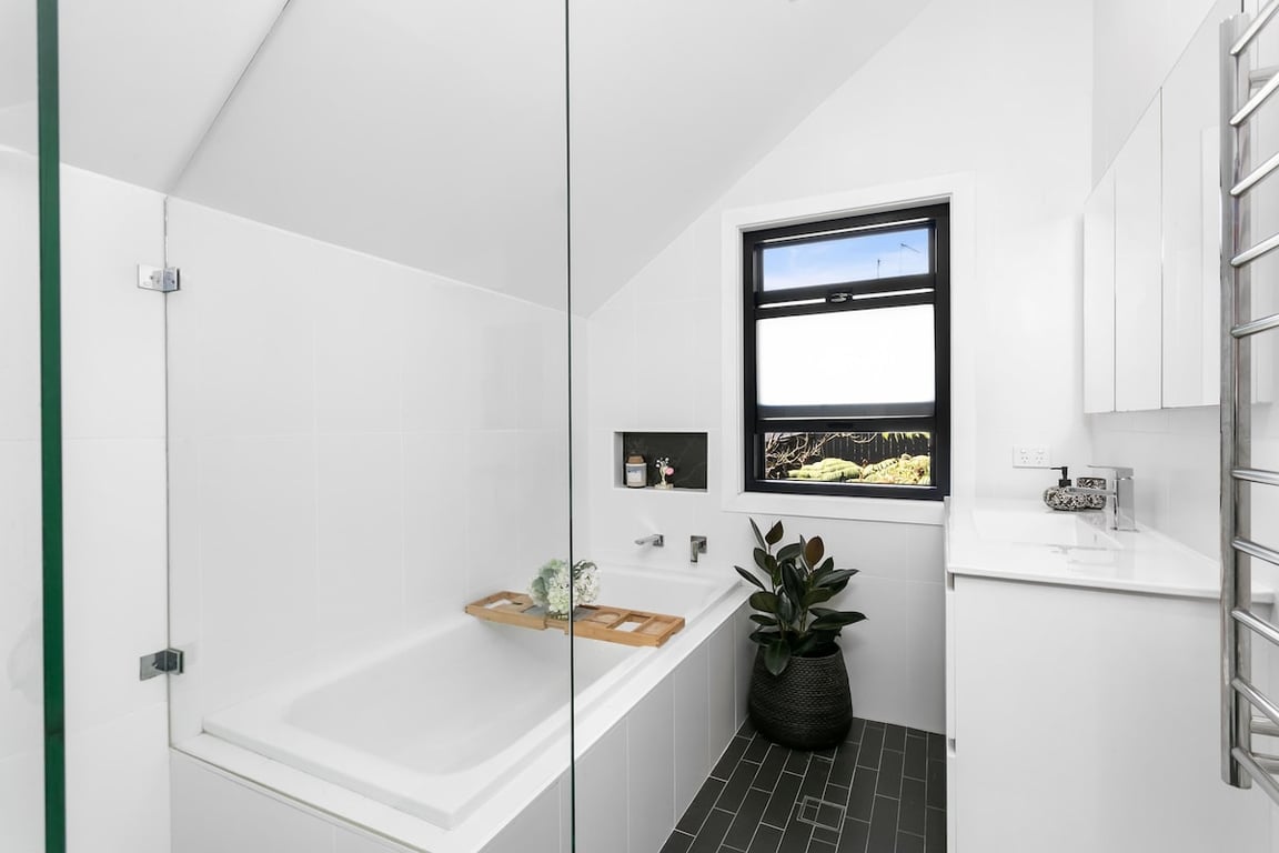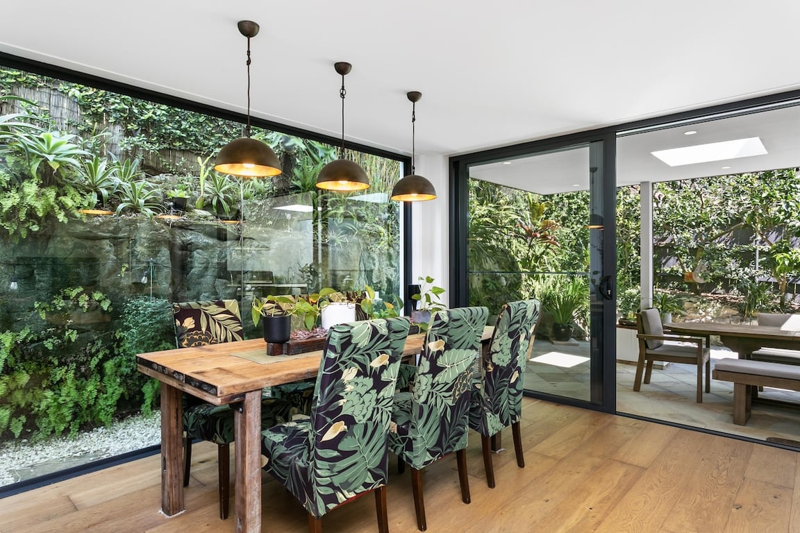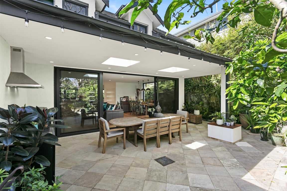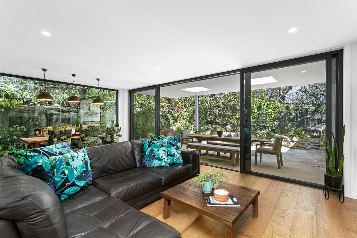 Hidden from the street at the end of a shared driveway, it’s wrapped in a newly landscaped courtgarden with a lush fern garden creating a tranquil introduction to the home.