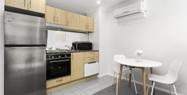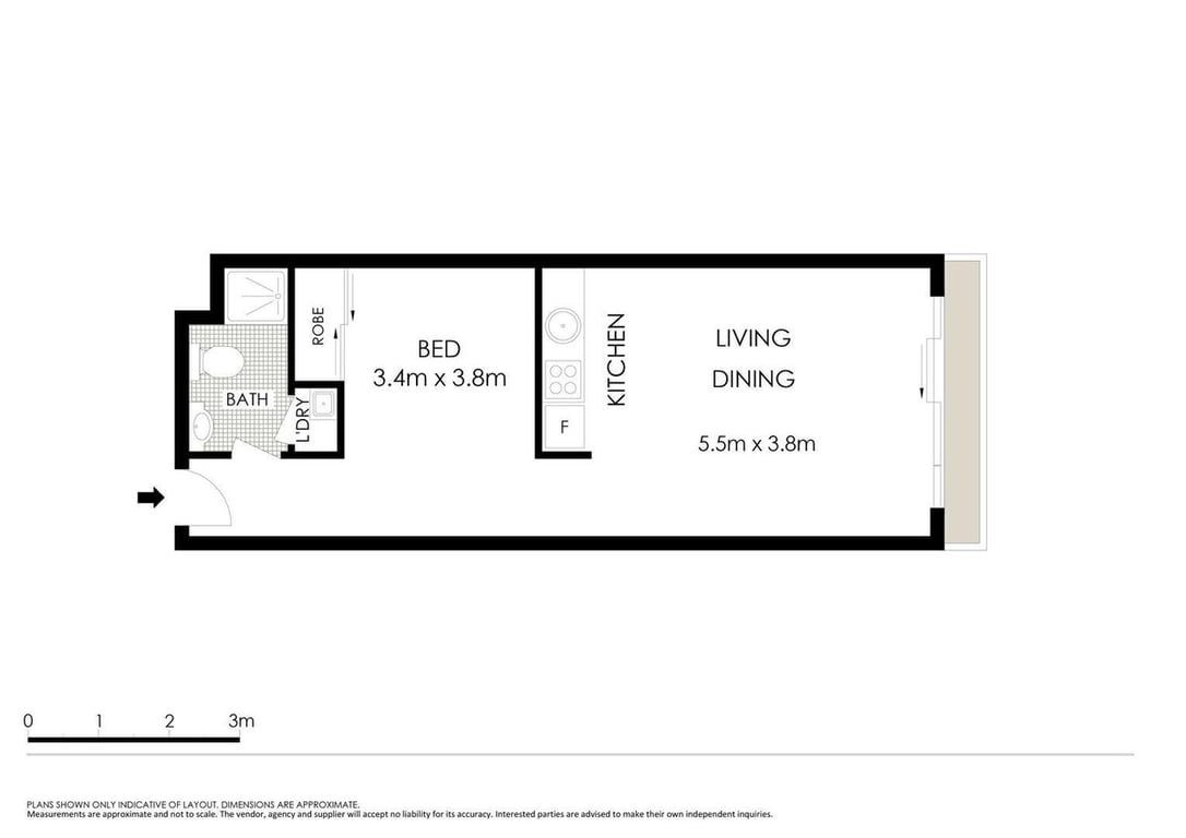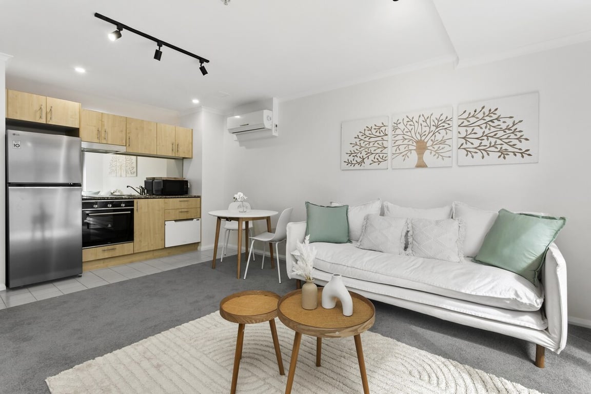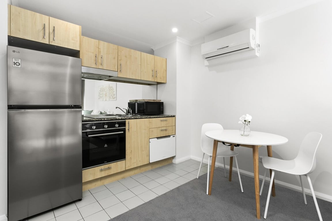 This stylish studio offers comfort and convenience, with distinct living spaces that enhance the feeling of a home. The bedroom area, featuring a built-in wardrobe, is separated from the open-plan living and dining area, as shown in the floorplan. Enjoy the privacy of a well-designed space, complemented by a fully equipped kitchen with modern appliances, including a dishwasher and a stainless-steel fridge.