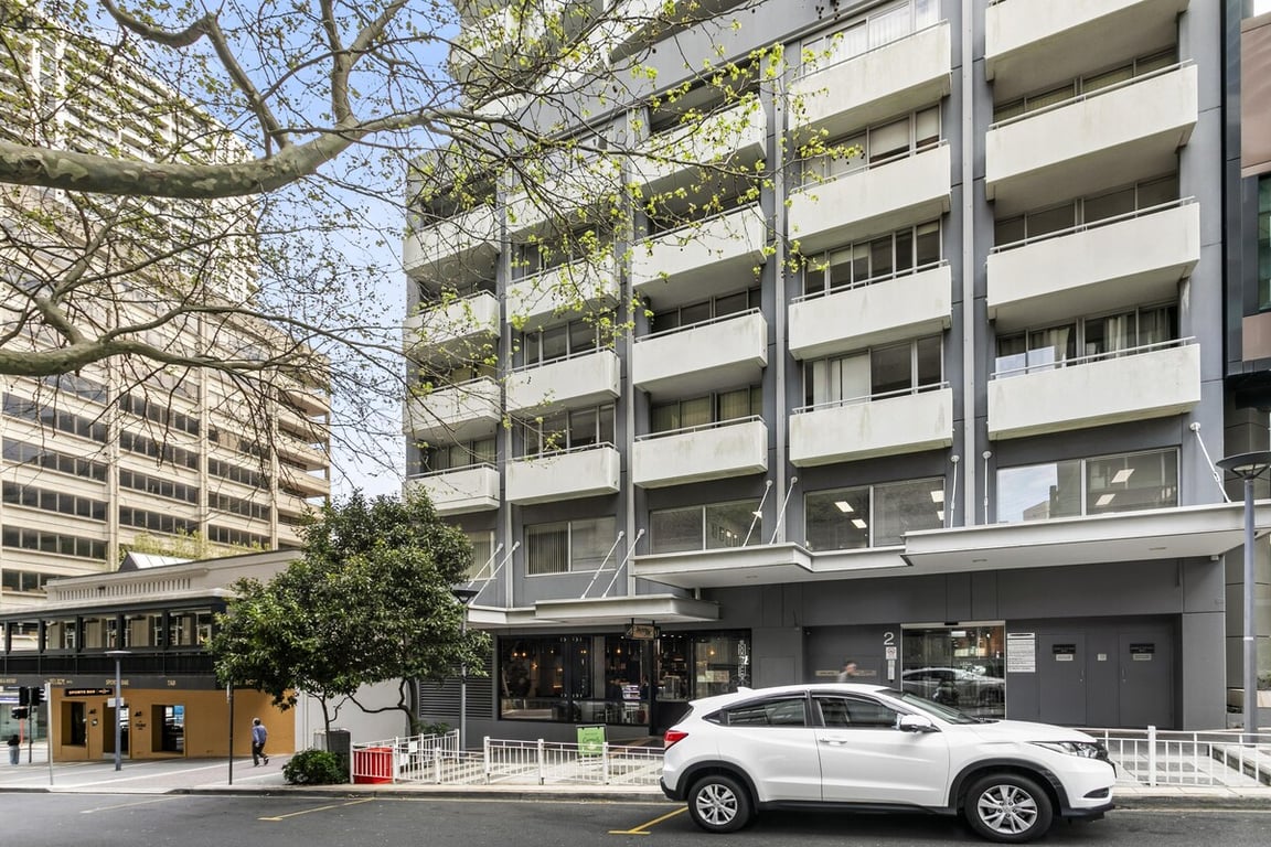 The apartment building’s exterior is modern and well-maintained, situated in a bustling yet cozy neighborhood. The layout of the apartment (visible in the floor plan) perfectly separates the bedroom from the living areas, offering an efficient and comfortable stay.