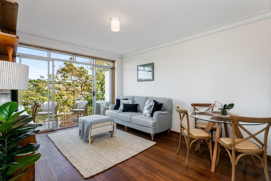 This elegant one-bedroom apartment boasts sweeping views over Mosman Bay to the North Sydney skyline. Bathed in northerly light, it offers refined indoor-outdoor living with a private balcony. Peacefully positioned with level street access, it is a short stroll to the ferry, Mosman Rowers, cafés, boutique shops, buses, and Reid Park — an ideal residence for corporate guests or discerning travellers.