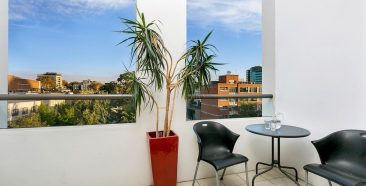 Modern open plan apartment with quality furnishings, air conditioning, and a balcony that overlooks a leafy residential area.