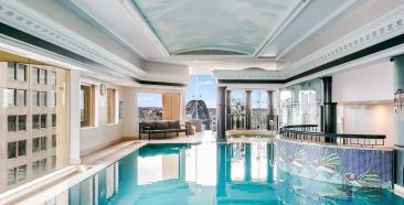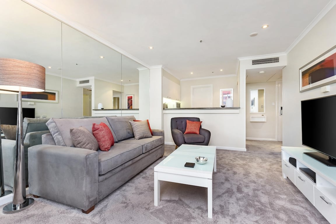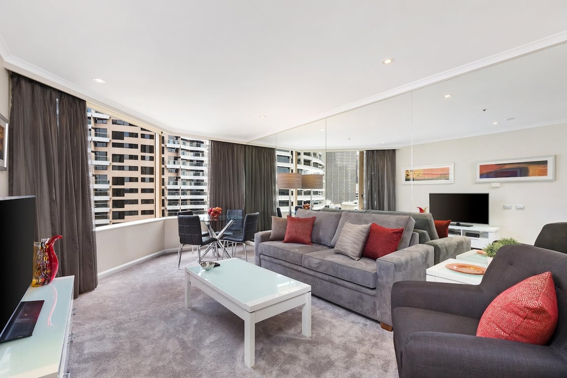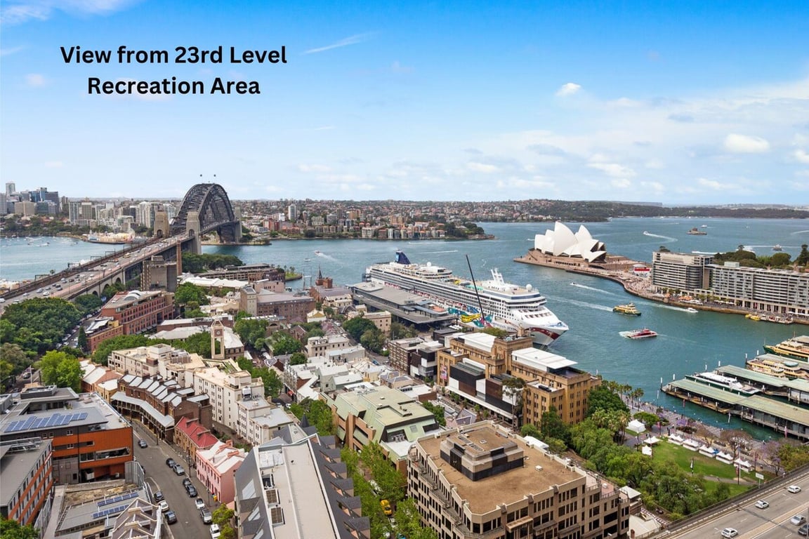 Guests have access to the 23rd-floor recreation deck, which includes a Roman-style heated indoor pool, spa, sauna, gym, and outdoor sundeck. The views across Sydney Harbour from here — including the Opera House and Harbour Bridge — are some of the most memorable in the city.
