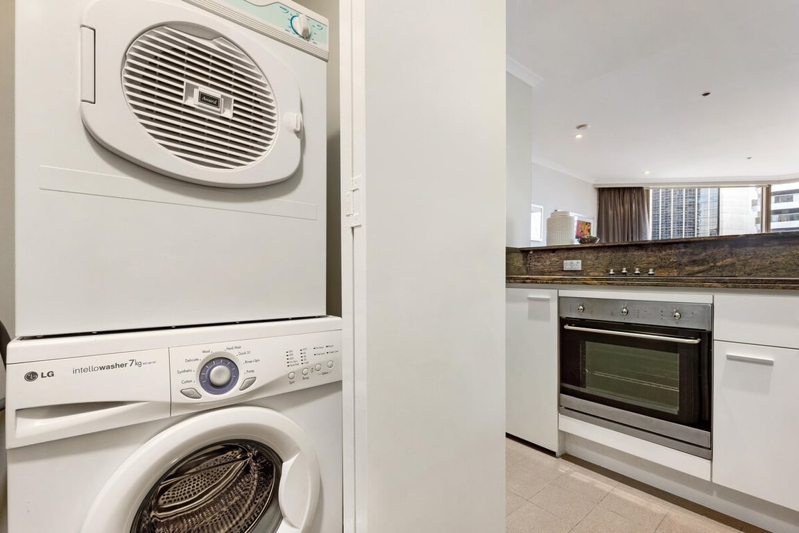 The bedroom is quiet and tastefully furnished, with a queen-size bed, built-in robes, smart TV, and blackout blinds to ensure a good night’s sleep. The bathroom features granite finishes and includes both a bath and a shower. There’s also a dedicated laundry with a washer, dryer, iron, and board — convenient for longer stays.
